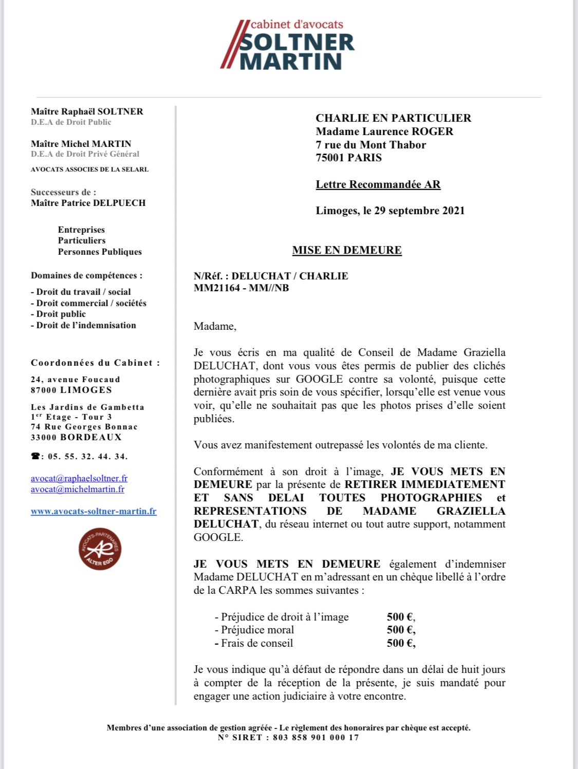 Je voulais changer de tête, ça a été réussi !! Je suis sortie de là maquillée comme un camion volé, avec une coupe complètement ratée et une couleur de mémé. J’ai du retourner chez mon coiffeur en rentrant chez moi pour récupérer une coiffure correcte. Madame Laurence Roger alias Charlie n’acceptant pas que je puisse remettre en cause la qualité de son travail a cru pouvoir, en guise de revanche, publier des photos de moi sans mon autorisation. J’ai donc fait un signalement à la CNIL et l’affaire est entre les mains de mon avocat (2 photos du courrier de mon avocat)