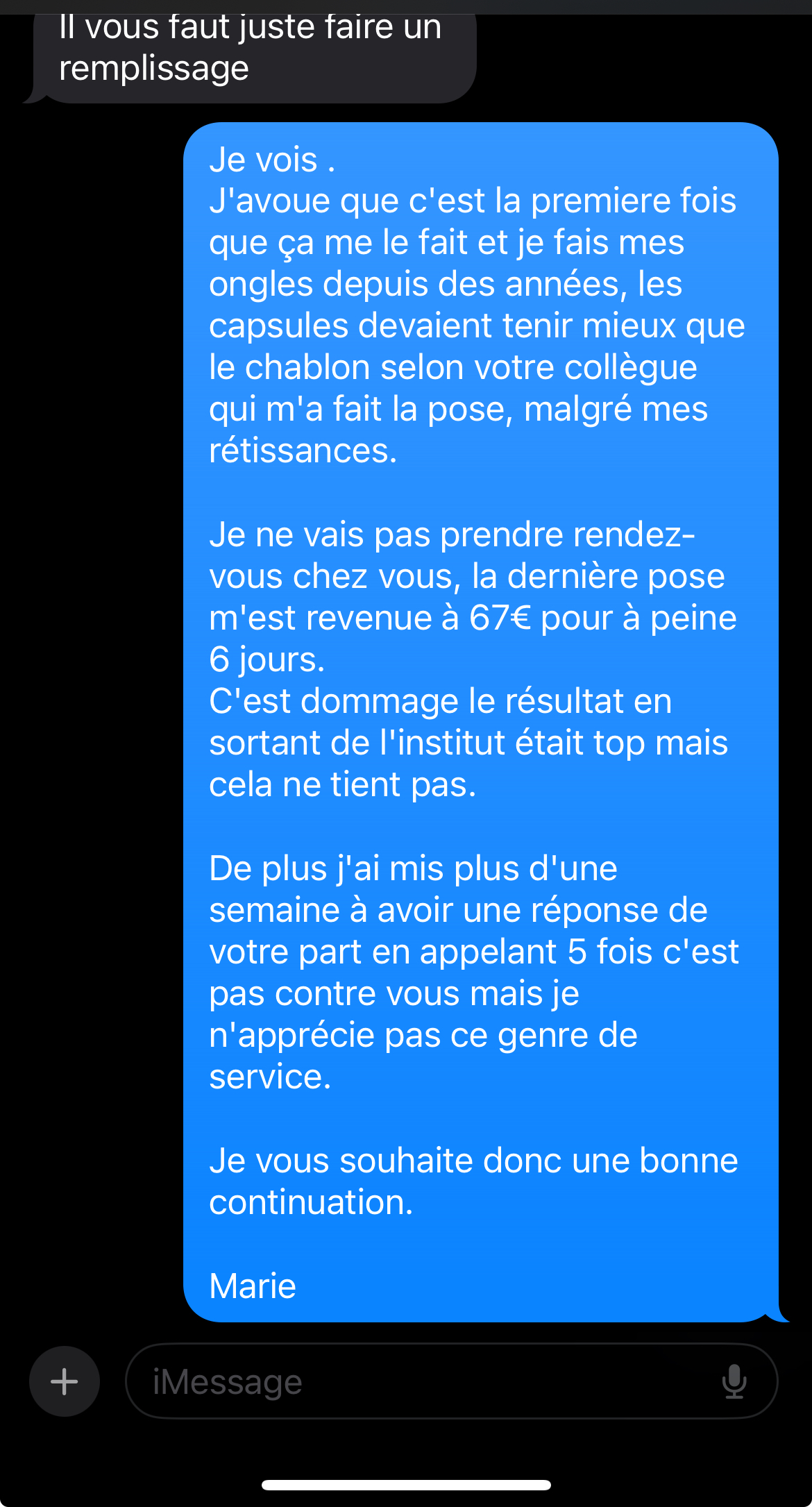 Je reposte mon avis puisque le précédent a été supprimé. (et est resté en plus sans réponse le peu de temps où il était visible) Je disais donc : Les points négatifs (le positif est à la fin.): - un décollement des capsules au bout de 5-6 jours - J’ai contacté l’institut à mon retour de vacances pour parler de cela et voir la marche à suivre personne n’a su quoi me dire à part « on vous rappelle pour vous dire ce qu’il en est. » - J’ai rappelé plus de 4 fois sur une semaine avec à chaque fois le même discours et personne ne semblait savoir que j’avais déjà appelé (belle communication au sein de l’équipe même si je sais qu’elles n’ont pas que moi à penser) j’ai enfin au bout de la 5 eme relance, la personne qui a fait ma pose au bout du fil qui me dit : « Envoyez-moi une photo du dessous de vos ongles que je vois ce qu’il en est et est possible de faire avec ma responsable » ce que j’ai fait et sans réponse une nouvelle fois. - Je rappelle donc et là une nouvelle fois pas au courant et en plus, on me dit que maintenant ça fait plus de 20 jours donc je dois payer une pause complète. (Normal vous avec mis plus d’une dizaine de jours à me répondre.) - Je vous épargne la mauvaise fois par message quand j’ai spécifié avoir envoyé des photos qui sont restées sans réponse où on me dit « aucune photo n’a été envoyée » et les fautes d’orthographe qui vont avec de plus quand enfin on me répond. (Voir capture en photo, on me dit que c’est normal, ce sont juste mes ongles qui poussent, euh non… Je sais ce qu’est un décollement et sur 7 ongles sur 10.) - J’avais pris rendez-vous pour une pose résine + extension chablon au final le jour où j’ai rendez-vous avec la personne qui fait la pose sur chablon n’est pas là, je n’ai donc pas d’autres choix que de mettre des capsules (j’avertis au passage que ce n’est pas ce que je voulais et que par expérience, je sais que ça tient moins bien sur mes ongles que ce que j’avais demandé, je fais des pauses depuis plus de 10 ans, la personne qui me fait la pose m’assure que les capsules tiennent mieux, de toute façon, je n’ai pas le choix.). - Je n’y suis allé que parce qu’on m’avait offert une carte-cadeau chez eux, au final, je me retrouve avec une pause à 67 € pour 6 jours de beaux ongles, c’est scandaleux. Dommage parce que la première impression était totalement différente. Le positif : - le salon est beau. - Il est bien placé. - Diversité de prestations (si toutes ont le même service non merci) - Équipe sympathique - J’étais contente du résultat à la sortie du salon. (voir photo) Je ne recommande pas du tout cet institut au vu du service client, de la prestation complément raté (au vu de sa longévité) et le fait qu’on me dise limite que je mens, puis qu’on supprime mon commentaire. Je continuerais à le poster pour que les gens soient avertis du service que vous proposez. Bonne continuation. Marie
