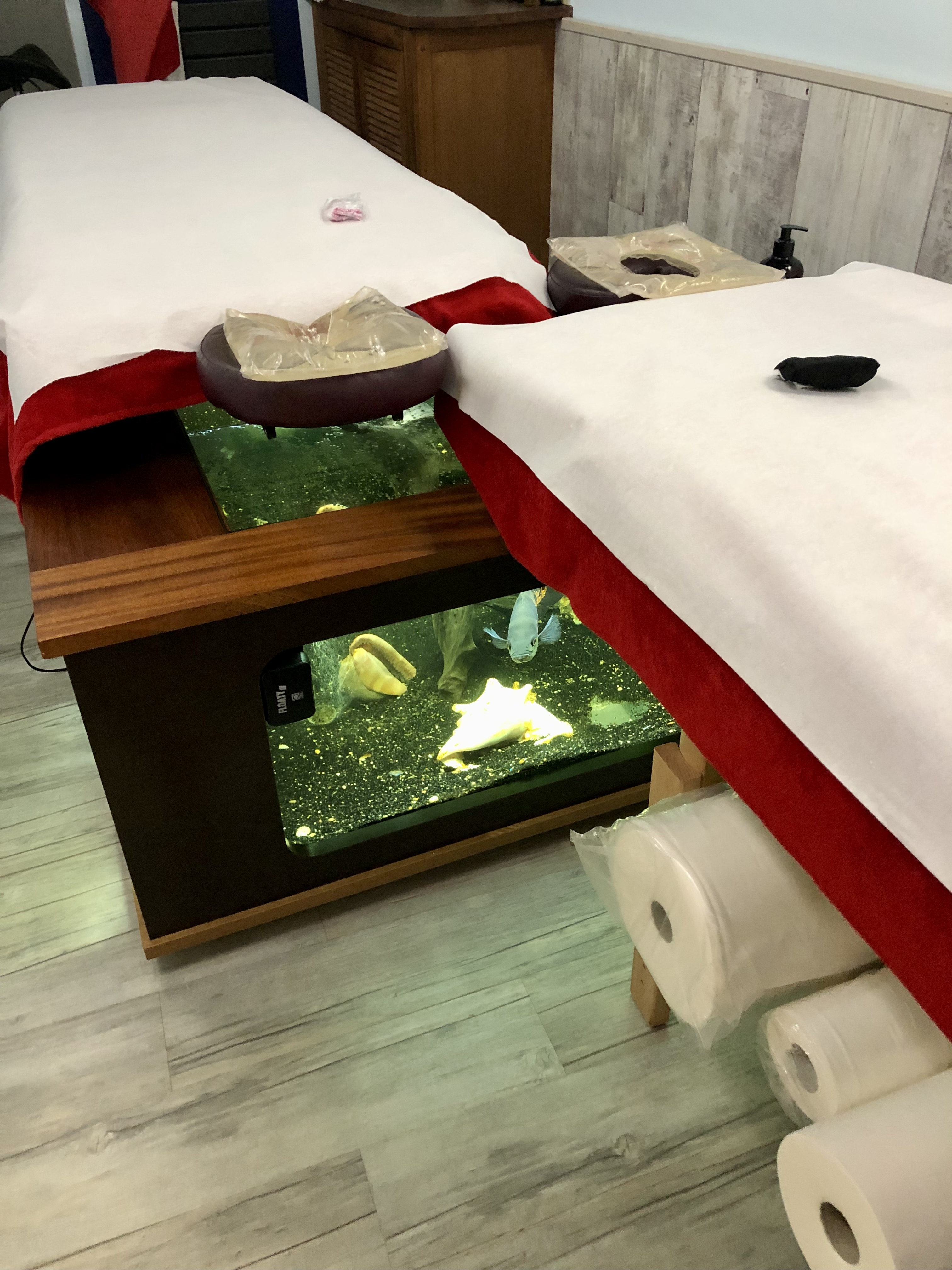 Nous avons réalisés une massage duo avec des coquillage 🥰 Je recommande vivement c est un super massage 👌🏻🔝🔝 Le grand plus l aquarium en dessous assure une détente optimal lors du massage du dos 🤩 Une bulle de détente hors du temps Allez y sans hésitation car la personne et chaleureux et aux petits soin