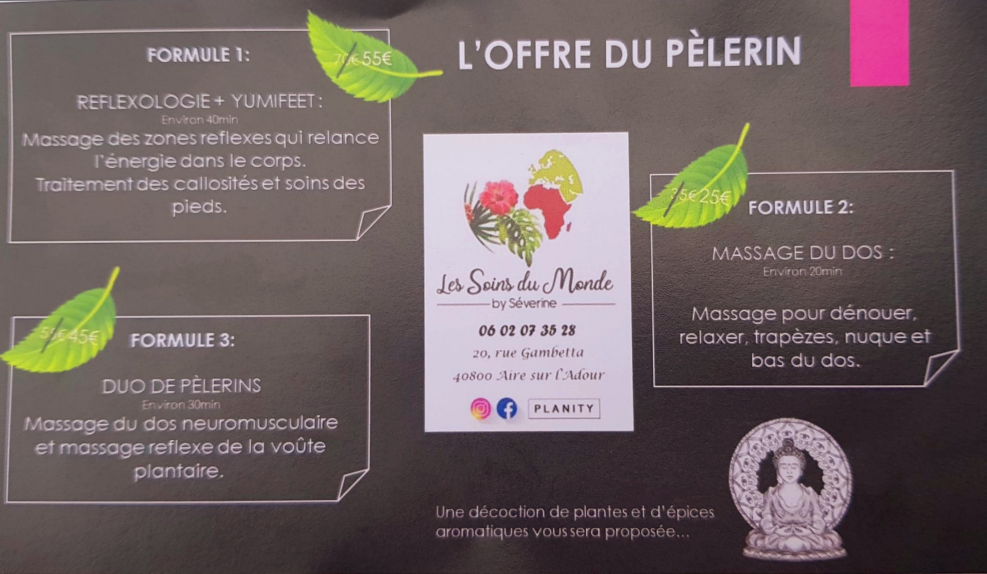 Pèlerine de Compostelle cherchant un moment de détente, j'ai adoré Les Soins du Monde ! Quand j'ai appelé, la stagiaire qui m'a répondu m'a bien conseillé pour choisir le soin adapté, et une fois sur place Stéphanie a été merveilleuse tout au long du massage. J'ai choisi un massage sous affusion d'eau et ça a été un vrai moment de bonheur ! Je recommande vivement l'établissement !