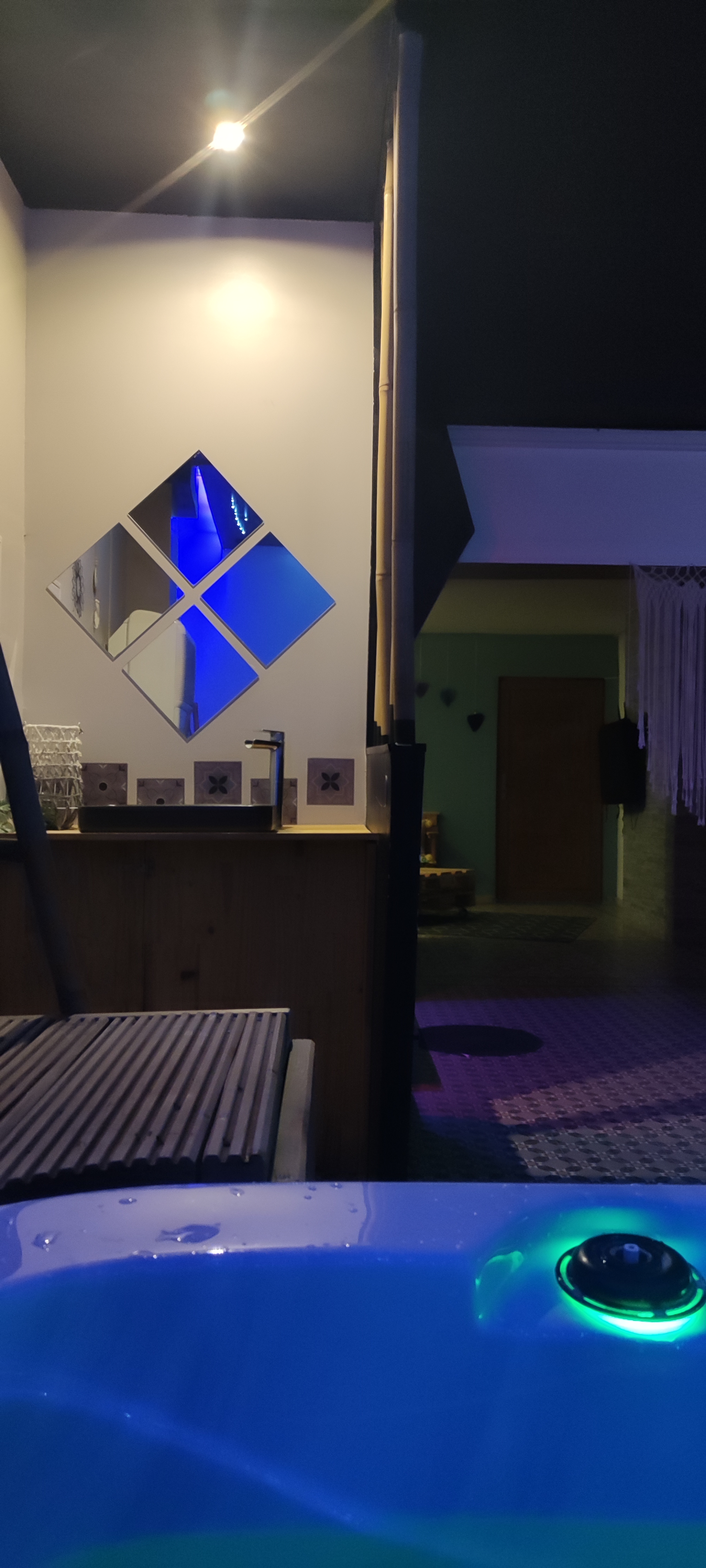 Décoré avec soins, acceuil chaleureux, discrète, top pour passer un bon moment, au choix doux et romantique ou fun avec la musique dans les enceintes du spa !
