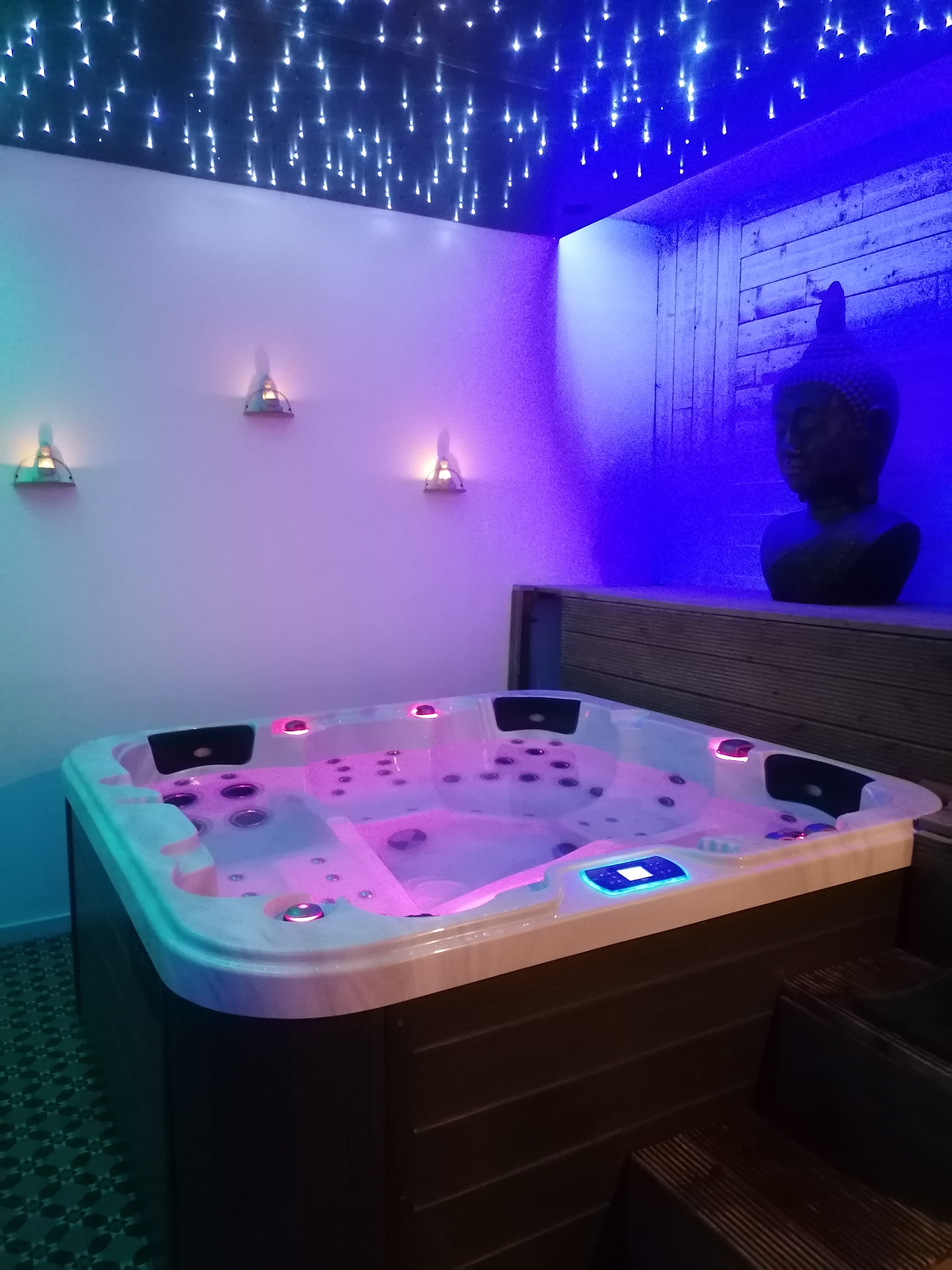 Nous avons passé une nuit au spa, c'était très agréable, un moment de détente totale 👍 Eau, café, thé, serviettes, peignoir, sèche cheveux à disposition. Douche ouverte très spacieuse. Jacuzzi en mode bluetooth avec vôtre téléphone, wifi à disposition. Lit king size. Télévision, petit salon avec canapé. La déco est très belle ( Bouddha) et jeux de lumières à votre convenance. Gérante agréable, disponible, souriante. Une chose est sûre nous reviendrons 👍