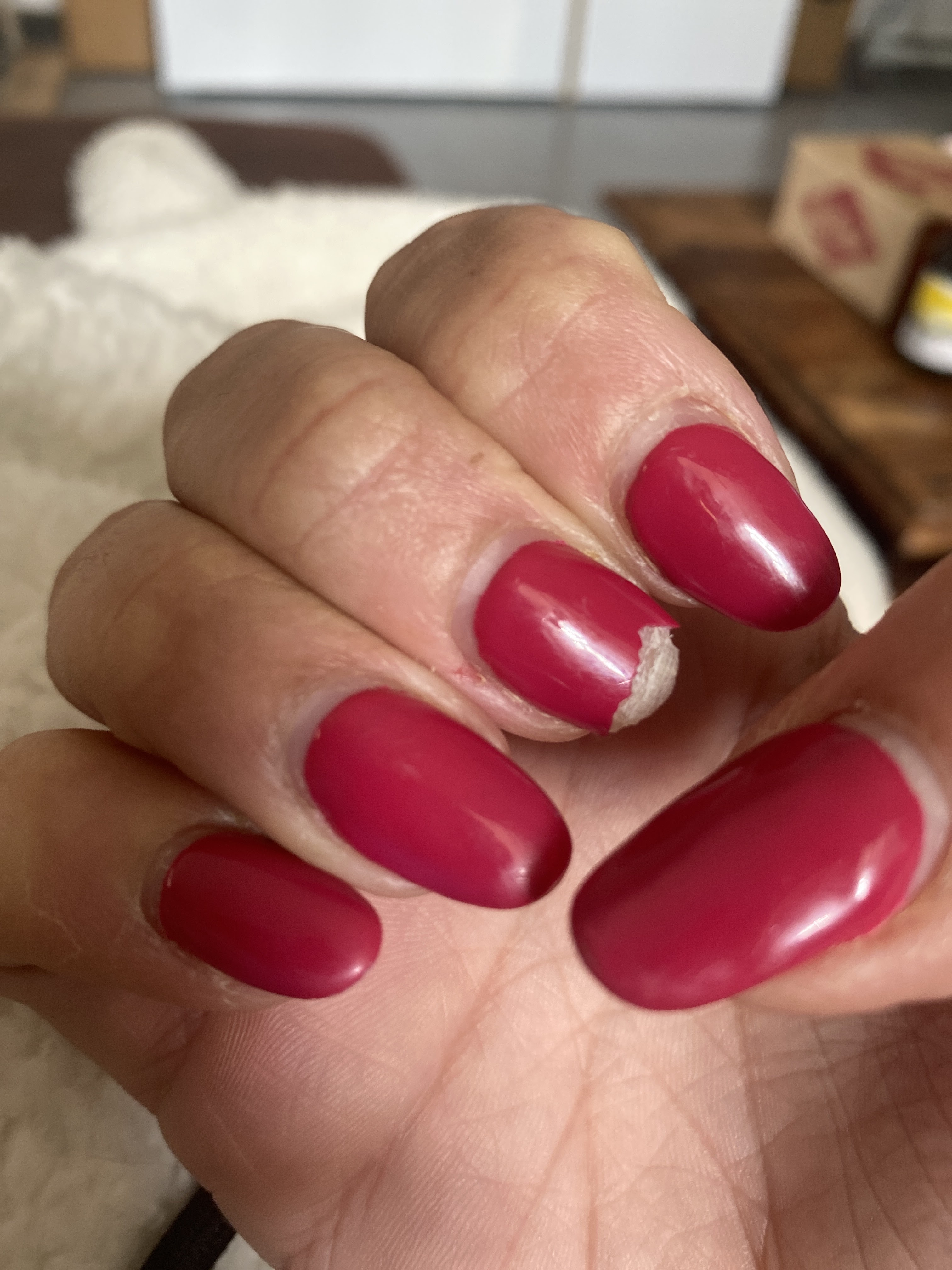 Mes ongles fait pour le 2e fois par une personne ils ne tiennent pas gondoles cassent cela ferait 2 semaines samedi donc 12 jours à peines Je suis pas satisfaite j’ai pourtant demander Lou mais je ne l’ai pas eu